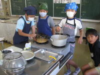 今日も5年生が調理実習でカレーライスづくりをしていました。先日別のクラスが作っていましたが、上出来でした。今回も林間学園で作るカレーライスの練習もかねてカレーと鍋で炊飯をやっていました。うまく火を調整しながらおいしそうなカレーができていました。林間学園では、ガスコンロではなく、薪で作ります。今日のようなおいしいカレーライスができるように頑張ってほしいと思います。