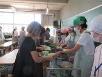 17名の保護者が参加し、栄養士から給食についての説明があった後、給食の配膳から保護者の方々で協力して行っていただきました。