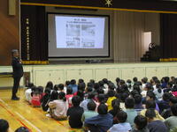 東深井小学校創立50周年をお祝いして、児童会が主体となって50周年祭が行われました。”深小シンフォニー”(5・6年生)によるリコーダー等を使った演奏、アンサンブルの発表、そして全校児童による校歌などが行われました。また、東深井小50年の歴史を振り返るスライド、”深小クイズ”など子ども達の思考をこらしたプログラムが行われました。また、東京理科大の学生さんの協力のもと、”深小EARTH”と題したプロジェクションマッピングが行われました。この日のために子ども達が海・森・サバンナ・日本・世界の都市をテーマにした絵を描き、それらを活用した動画を作成し上映してくれました。子ども達も大興奮の一大イベントになりました。最後は全校合唱で♪ふるさと♪を歌い、「これからも東深井小を母校として頑張っていきましょう」という話で締めくくられました。東深井小の児童達による本当に素晴らしい会でした。