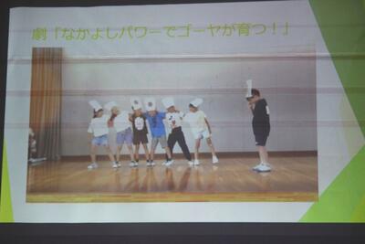 当日は、5年生が鰭小50周年キャラクターの「ヒレピレー」を使った映像で学校を紹介しました。多目的室や校庭、