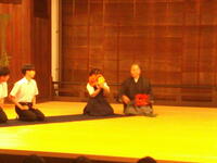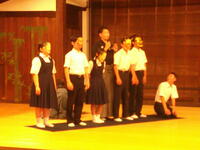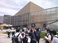 京都での班別行動の後、大江能楽堂にて能の鑑賞・体験を行いました。各学級の代表者が舞台に上がり、能で使用する様々な種類の面をつけました。面をつけると視界が狭くなることを、他の生徒も手を使って疑似体験しました。社会や音楽の授業でも扱う能・狂言ですが、実際の演者から話を聴くことができる貴重な時間となりました。生徒たちも、しっかりした態度で話を聴いており、普段の学級や集会での姿が表れていたと思います。最後は能舞台を背景に、学年集合写真を撮影することができました。