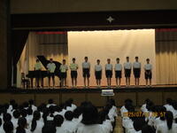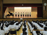 4月15日(火)に新入生歓迎会が行われました。まずは全校委員長が委員会紹介をしました。各委員会でどんな活動をしているのかを説明し、生徒会活動のイメージを伝えていました。次の部活動紹介では、各部2分間という短い発表時間でしたが、それぞれ工夫のある演出があり、新入生の楽しそうな笑顔が見られた時間となりました。そして各学年からの発表では、2・3年生の成長した姿が見られる合唱、中学生として頑張っていこうという気持ちの伝わる新入生の校歌が披露されました。「新入生」から「1年生」として、気持ちも新たに中学校生活を送ります。