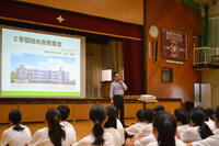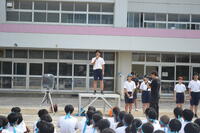 実行委員長の深川さんは、スローガン「楽学両道~過去に学び、未来を体験する修学旅行~」について、そしてこれまで学年で取り組んできたキャンペーンにふれ、修学旅行成功に向けて、学年全員で気持ちを高めようと話しました。