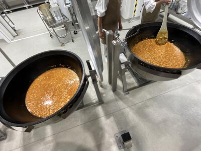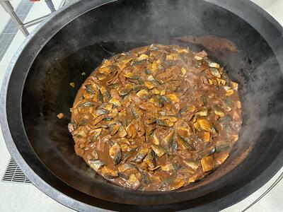 鯖の味噌煮は生臭さをとる効果のある生姜・長ねぎを一緒に釜にいれ、1時間以上煮込みました