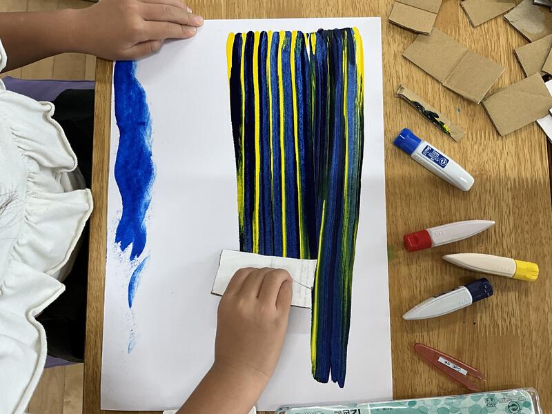 画用紙に直接絵の具を出して、段ボールでひっぱると……
