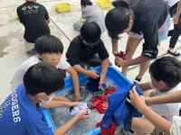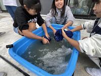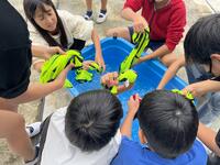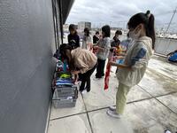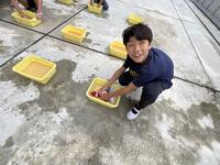 「来年も気持ちよく使えるように」と、バケツに水をくんで、やさしく手洗い。よごれを見つけては「ここ落とそう!」と声をかけ合いながら、みんなで協力して作業を進めました。冷たい水に手を入れながらも、笑顔を見せて取り組む姿がとてもすてきでした。