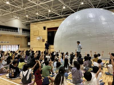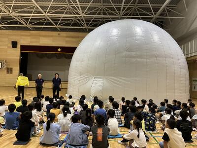 今日は、つくばエキスポセンターから市野谷小の体育館にやってきた「移動プラネタリウム」で夜空の星の動きや星座について学びました