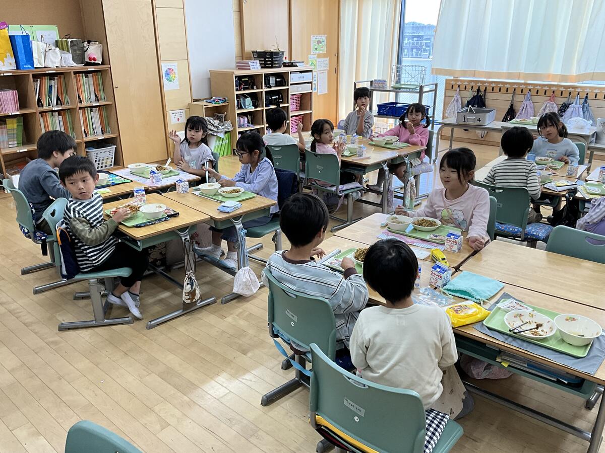 しりとりをしたり、ダジャレを言い合ったりしながら、和やかな雰囲気で給食をいただきました。
