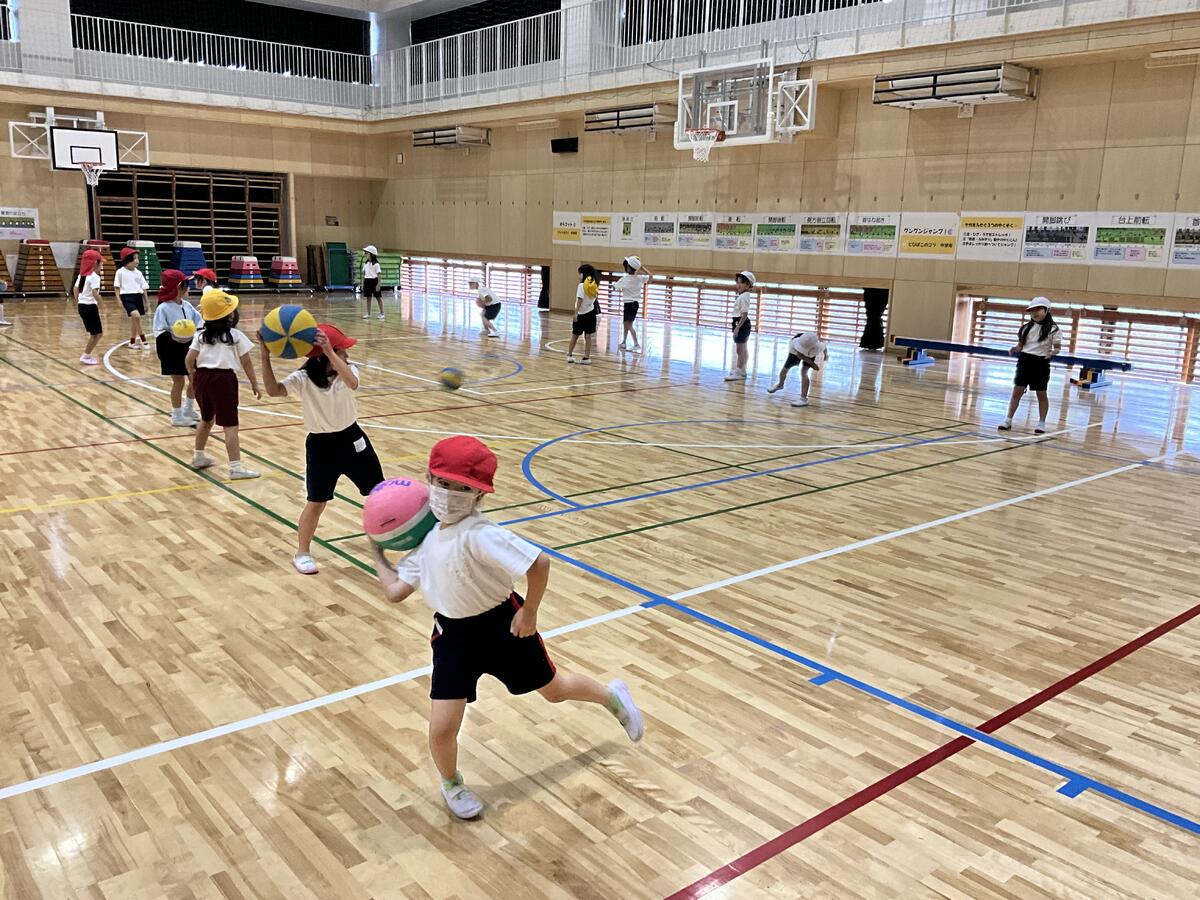 給食のあとは、みんなで体育館でドッジボールをしました。