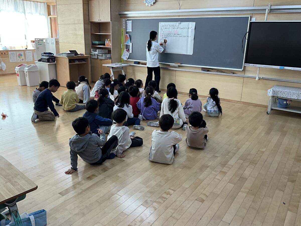 最初は少し緊張していた様子の子どもたちも、自己紹介をしたり好きな食べ物の話をしたりするうちに、すぐに笑顔に。一緒に号令をかける姿はとても可愛らしかったです♪