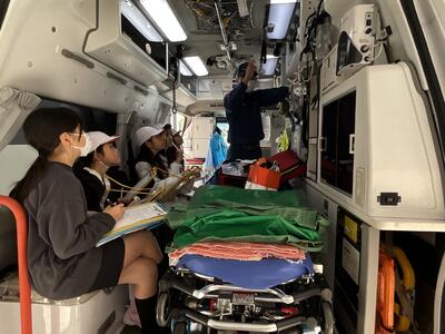 次に、消防車や救急車、ポンプ車、ハシゴ車などの車両を見せていただきました。