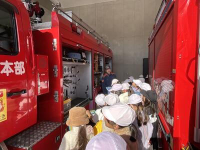 実際に近くで見る車両はとても大きく、道具もたくさん積まれていて、子どもたちは興味津々でした