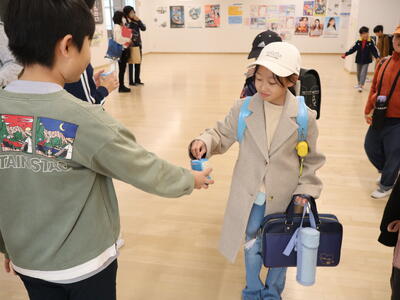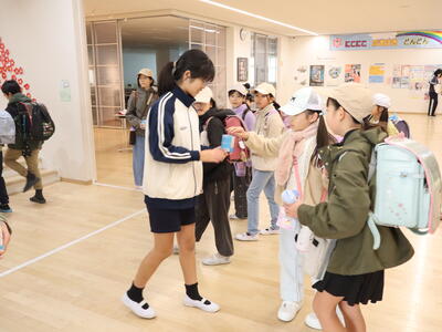 募金を持ってきてくれた子どもたちに対して、SDGs委員会の子たちは感謝の気持ちを込めて赤い羽根を丁寧に手渡し、そこには心のこもった温かなやりとりがたくさん見られました。