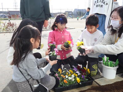 本日、業間休みとお昼休みを使って、地域の方からいただいたパンジーの苗を児童のみんなで植え替えました。