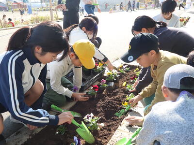 職員室前の花壇は、子どもたちが一株一株丁寧に植えたパンジーの花で、すっかり華やかな新しい装いに変わりました。寒くなる季節の中でも、色とりどりの花々が学校に温かさを添えてくれています。