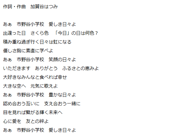 「私が育ち、夢を育くんだ流山。そんな地元の新小学校の校歌を作成する事が出来、とても嬉しく、光栄で、幸せな気持ちでいっぱいです。子供たちが覚えた瞬間に感情を込められるような校歌。卒業し、大人になる過程で振り返った時にも愛してもらえる校歌。そんな校歌を目指して書きました。市野谷小学校のみんなが歌っている姿を見るのが今から楽しみです。そしていつか、一緒に歌える日が来る事、子供たちの健やかな成長を心から願っております。」