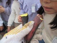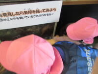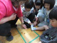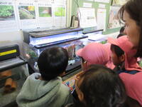 1年生の教室に行くと、机の上に虫が一匹。すると「虫博士!」とお友達が呼ばれ、皆が集まってきました。虫がいると虫に詳しい児童が説明をしてくれるそうです。今回は、すぐに飛んで行ってしまったので残念でした。今日は響保育園の児童と先生方が小学校体験に来校されました。校舎内の案内では、校長室で質問を受ける時間がありました。小学校はどうして皆同じ時間に登校してくるのかや、帰る時間がみんな同じなのかなどの質問がありました。後半のグループでは園児からの質問がなかったので、1年生が代わりに質問してくれ、今日のABCタイムの続きの様な、好きなキャラクターや好きなスポーツを聞かれました。とても楽しいひとときでした。また、ウーパールーパーや熱帯魚、カブトムシの幼虫にも興味津々の園児達、1年生は水槽内の説明もしていました。また、昨日作るところを見ることができなかった「あきとともだち」の作品作り、どんぐりや松ぼっくり、箱や紙コップなどを使って、色々な物を作っていました。