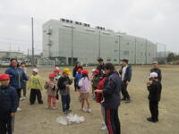 グランドでは、1年生が以前図工の授業で使った大きな大きな新聞紙を使って鬼ごっこやゲームを楽しんでいました。大きな新聞紙の中に入っている人が誰かをあてるゲームをとても楽しそうにしていたので、こっそり混ぜてもらいました。大きな新聞紙の中に入ってみると、とても温かく、わくわくした気持ちになりました。最後は、焼き芋用に新聞紙を丸めてくれて、ゴミ袋にストック、まるでサンタさんのプレゼント袋のようでした。そして、どんどん人がつながり、長い列車ができ、蛇行運転や急カーブなど楽しく身体を動かしました。
