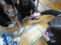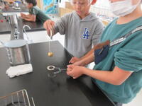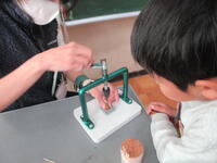 4年生の理科の授業では、実験を行っていました。防護めがねをしっかりかけて、金属球を熱したり冷ましたりしながら体積が変わるかという実験をしていました。金属球がわっかを通り過ぎるとおっ~と歓声が上がっていました。発見、感動理科の実験は楽しいです。