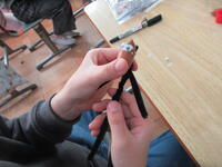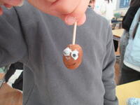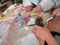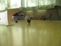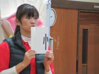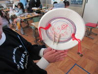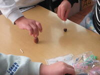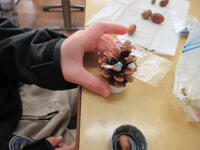 1年生の教室に行くと・・・。生活科「あきとともだち」で作った物を見せてくれました。その中で、どんぐりコマの対決を教えてもらいました。私は、人差し指と親指でコマを回しましたが、中指と親指の方が良くまわることを教えてくれて、よくまわるようにイメージしながら素振りをして、いざ回してみると、本当によくまわる!今度は、作っているところを見せてほしいとお願いしました。