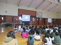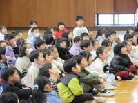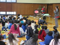 午後は、芸術鑑賞会を実施しました。今回は、制作団体 特別非営利活動法人国際文化交流促進協会カルティベイト様の企画公演「日韓トップダンサー夢の競演『これがヒップホップダンス!』」で世界で活躍するダンサーの皆さんが素敵なパフォーマンスを披露して下さいました。軽快な音楽が流れる中こども達が入場してくると、体育館にはたくさんのシャボン玉が!それだけで心わくわくしてきました。音楽が流れると自然と身体を動かしリズムにのる児童もたくさんいました。ヒップホップダンスとは何かを公演の中で教えて頂きました。ロックダンス、ポップダンス、ブレイクダンスなど各スタイルの特徴を生かしたダンスを披露しながら世界で活躍するダンサーのすごい演技を目の前で見る児童達は目を輝かせていました。ヒューマンビートボックス(ボイスパーカッション)では、ダンサーの方の動きと流れる音に皆目を丸くしながら、驚きの声が上がりました。そしていよいよ「ダンスバトル」いざこざがあると暴力で解決をしていた若者がダンス対決で決着をつけるという武器による戦いでなく、文化による戦いそして最後は互いに握手でノーサイドという展開を目の前で体験しました。会場全体が審判になり、レッドチーム、ブルーチームのどちらがより素晴らしい演技を披露したかを拍手や応援の声、そして立ち上がりジャッジしました。どちらのチームも世界で活躍するダンサーさんたち、さすがの演技に会場は盛り上がりました。そして最後は、「みんなで踊ろう!」の時間です、事前のワークショップでダンスを教えて頂いた4~6年生が最初に踊りました。見ていた1~3年生もすぐにでも踊り出せる体勢でスタンバイ、ダンサーの達に教えて頂きながらあっという間に踊れるようになり、最後は会場全体でダンスを楽しみました。質問コーナーでは、「ダンスを始めたきっかけや、年齢、ダンスをしていて楽しかったこと」などたくさんの質問に答えて頂きました。たくさんの児童が挙手をしていました。今回の講演、韓国やニューヨークから駆けつけて下さったダンサーの方もいて素敵なダンスを見ることができただけでなく、照明や音響、スモークなどの舞台装置など講演を成功させるためのチーム一丸となっての取組は大変素晴らしく、下校するこども達からも「ダンス良かったね」とか「すごかったね」という声がたくさん聞こえてきました。カルティベイトの皆様、ありがとうございました。