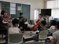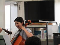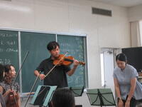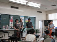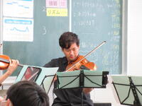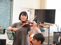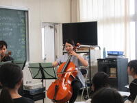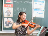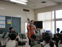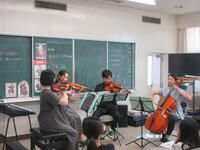 5年生の音楽の授業で弦楽鑑賞会を行いました。2~4時間目に1クラスずつ、日頃の音楽の授業と同様に音楽室に移動して授業の開始を待つ児童。チャイムが鳴り、音楽の先生の「入場です」の声で演奏者の皆さんが登場すると、「バイオリンだ、うぁー」など感想を口にする児童達、前で演奏者の皆さんがチューニングを始めると「シーン」となる児童。では1曲目・・・「アイネクライネナハトムジーク」の演奏が始まると、みんな知ってる曲だと言うこともあり、児童は笑顔になり、身体全体でリズムをとりながら楽しそうに聞き入っていました。その後ヴァイオリン、ヴィオラ、チェロの音色の聞き比べです。ヴァイオリンで「さんぽ」の二重奏を、ヴィオラで「君をのせて」、チェロで「第二小校歌」を演奏してくださいました。楽器の大きさと音域についても説明があり児童は弦楽器の特徴をしっかりと聞いていました。授業の後半はミニコンサートです。アニメの主題歌や、弦を弾いて演奏する曲など、様々なジャンルの曲が披露されました。弦楽器の演奏方法や特徴についても紹介され、みんな興味津々で聞き入っていました。特に「糸」の演奏は、豊かな弦楽器の音色を児童は味わってきくことができました。 最後は、4年生の時に歌った「ハピネス」を演奏してくださり、演奏に合わせて手話を交えながら歌を歌いました。こども達は、生の演奏に大変感動しました。素敵な演奏会を企画してくれた音楽専科の先生、ヴァイオリン奏者の小川千怜様・飯島茜様・ヴィオラ奏者の秀岡悠汰様、素敵な演奏をありがとうございました。