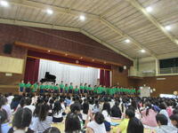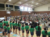 数日前までの暑さが嘘だったかのような、すっかり秋を感じる気候となりました。今日は、23日に行われる音楽発表会に参加する、音楽部を励ます会を行いました。全校児童が体育館に集まって行う予定でしたが、明日、3年生校外学習等が予定されているなど感染症対策として、4~6年生が体育館に集まって実施しました。低学年については、後日録画を視聴する予定です。音楽部は、4月から5年生が加わり総勢52名で練習を行ってきました。今回は「塔の上のラプンツェル」と「そりすべり」を演奏します。音楽部の発表の際には、聞いている皆が素敵な音楽に魅了され、とても集中していました。応援団の応援にも力が入り全校の気持ちが音楽部の皆に伝わったと思います。聞く度に素敵な演奏になっていて当日が楽しみです。頑張れ音楽部!