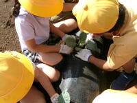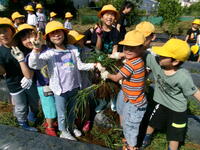 秋晴れのもと、やっと草取りに行けた2年生。どれが雑草なのかわかると活動がダイナミックになる子どもたち。「うんとこしょ、どっこいしょ!」雑草が抜けないと先生を呼んできました。やっと抜けると達成感のピース!!