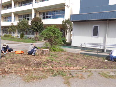 体育祭に向けて、体育館脇の草刈り、グラウンド周りと保護者用駐輪場の草刈りを行いました。