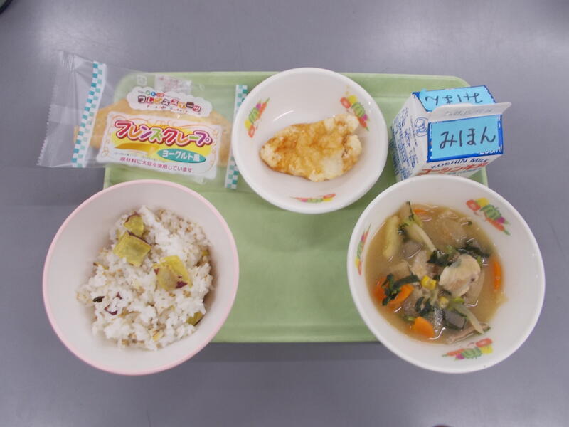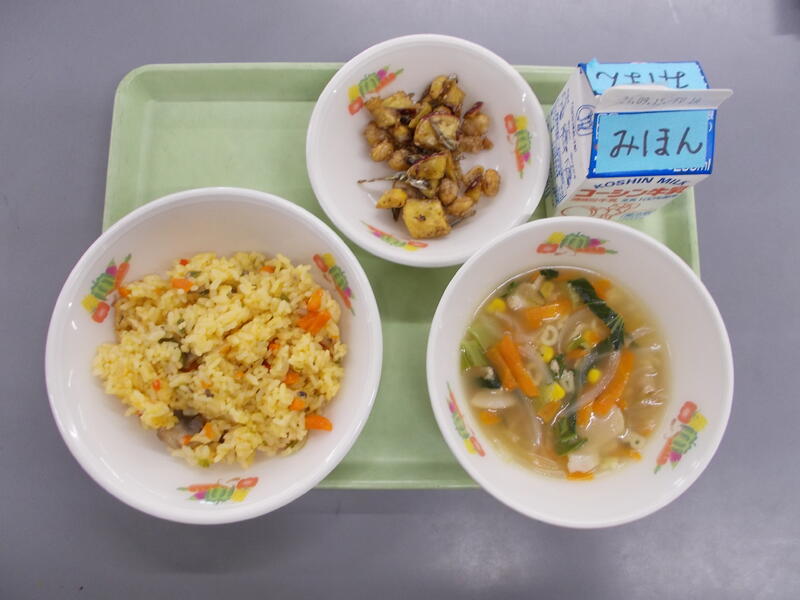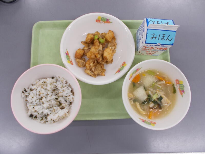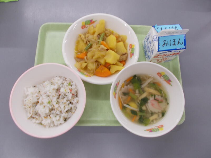 今日のごはんは、揚げたさつまいもと菜めしごはんの素、ごまを炊き上がったごはんに混ぜた混ぜごはんです。さつまいもをあげたことで崩れにくく歯ごたえがありました。また菜めしごはんの素が入り塩分も加わったので、甘みと塩味でとてもおいしくいただきました