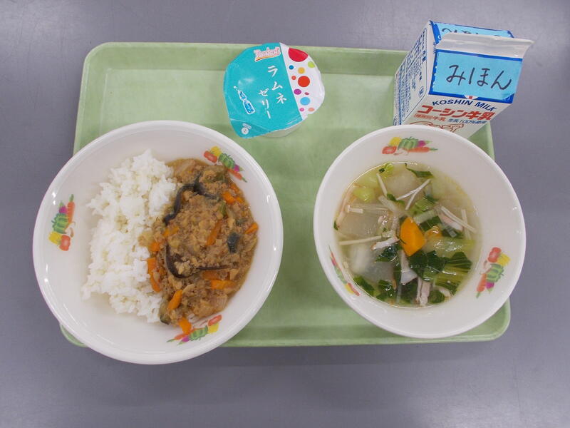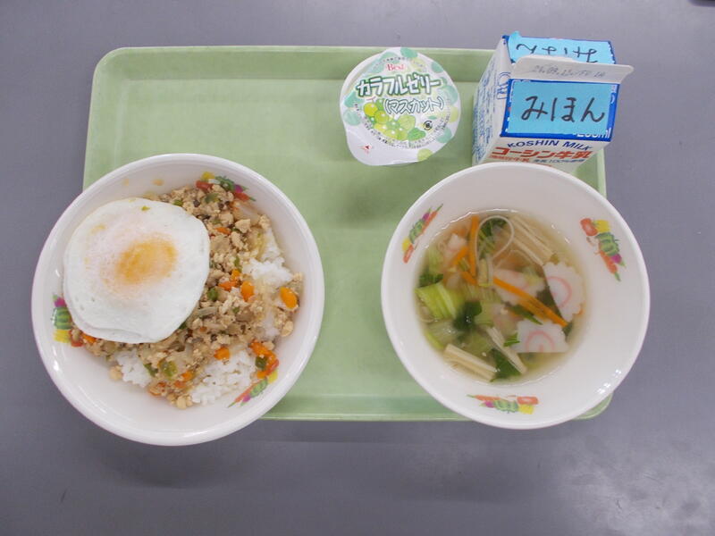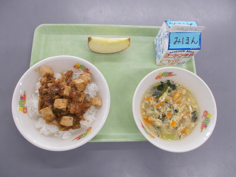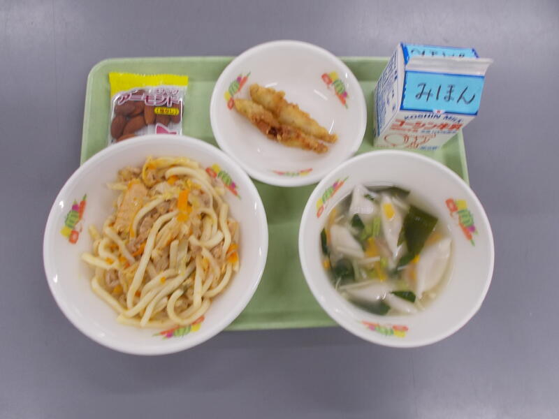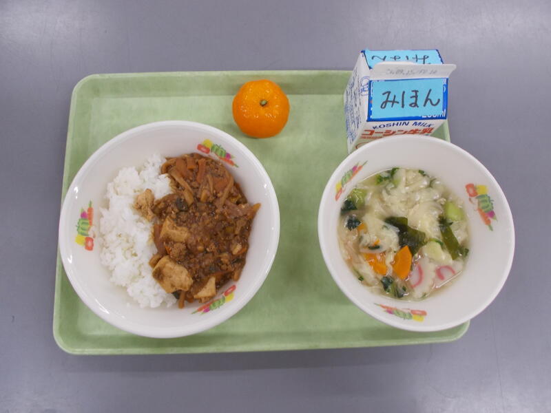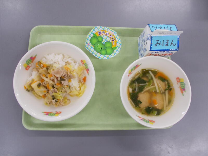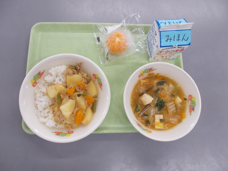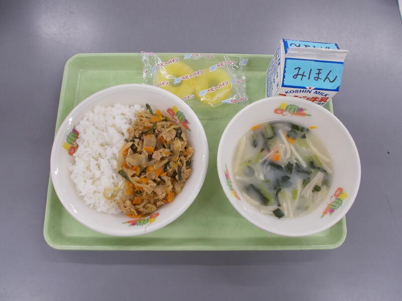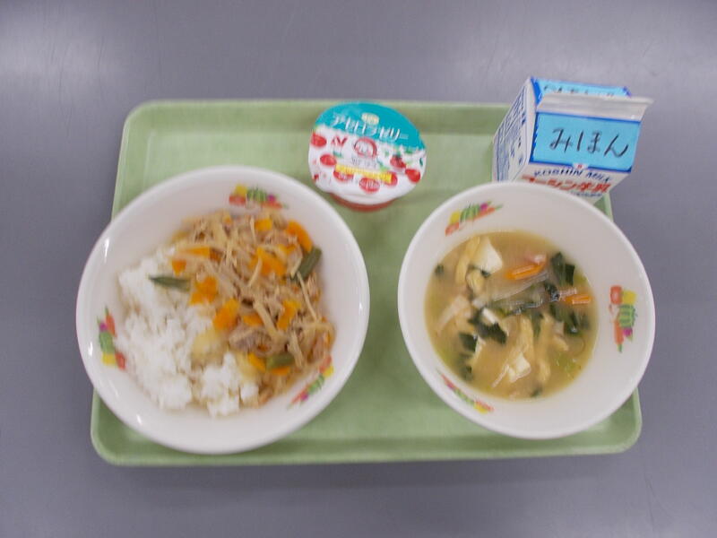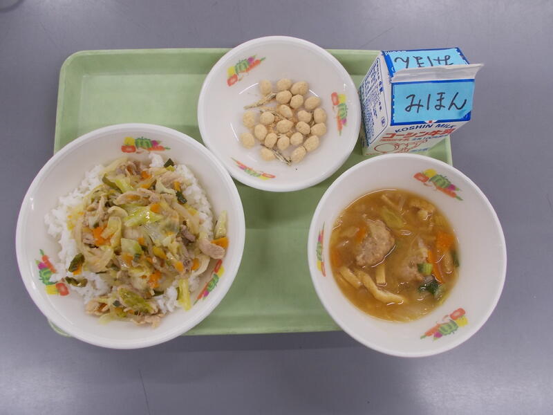 今日は流教研のため給食時間がいつもより早かったので、調理作業がシンプルなどんぶりメニューにしました。どんぶりメニューは子どもたちも配膳や食べるのがパパッとできるので短縮日課のときはどんぶりメニューが多くなります。今日は豚肉どん、豚肉とたまねぎをだしを効かせた味つけで煮込み、つゆだくで食べるのがとてもおいしいです。子どもたちの人気メニューのひとつです。