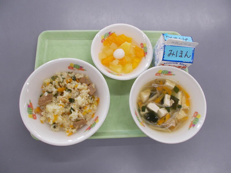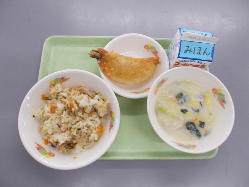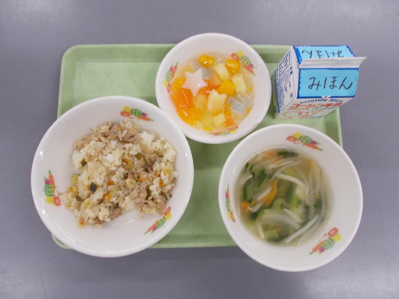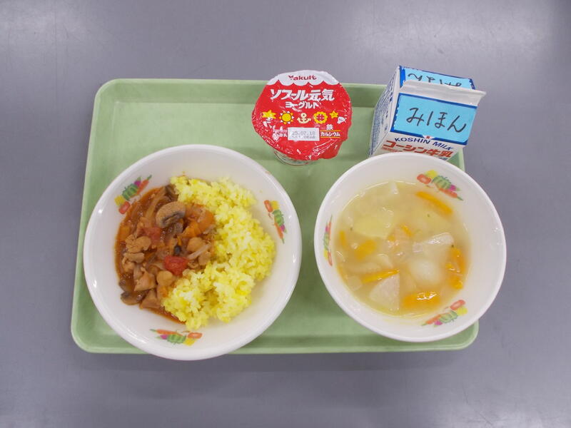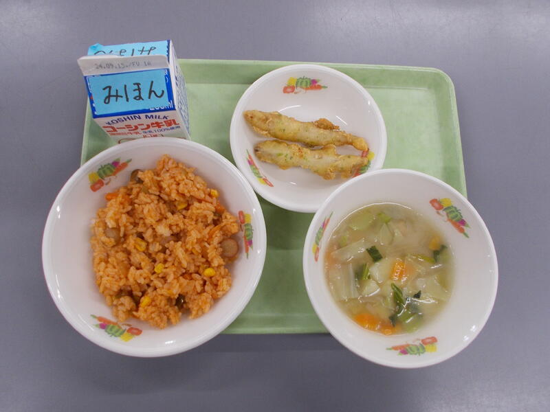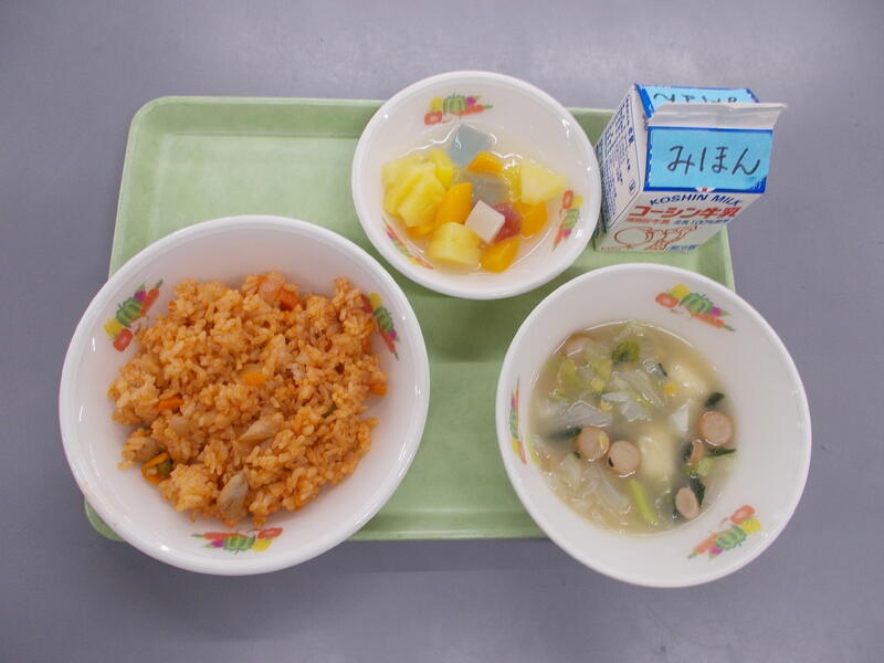 ジャンバラヤにはカレー粉やチリパウダーなどピリッとするスパイスが入っていて作りたては香りが際立ち子どもたちには強すぎるかと心配しました。でも給食時間になるとふわっとした香りになり食欲がすすみました。ウインナーも入り子どもたちもおいしく食べられたようで残菜も少なかったです。