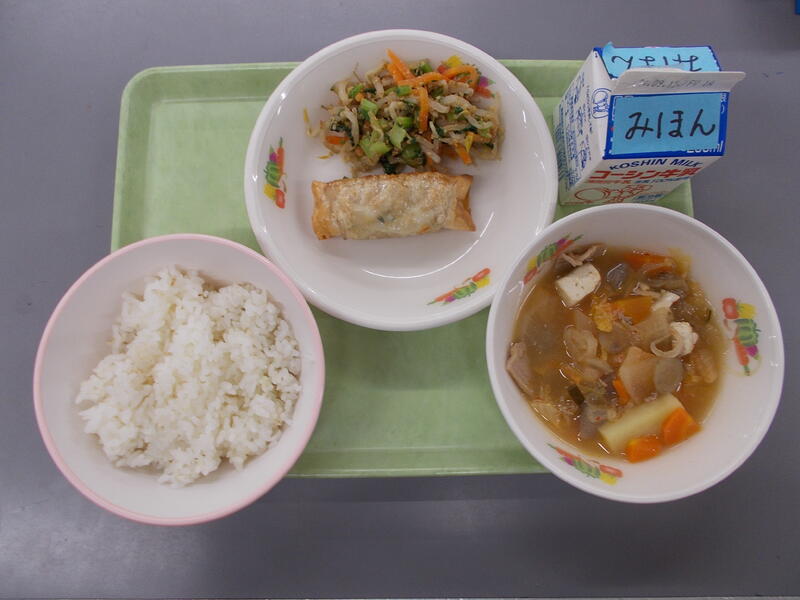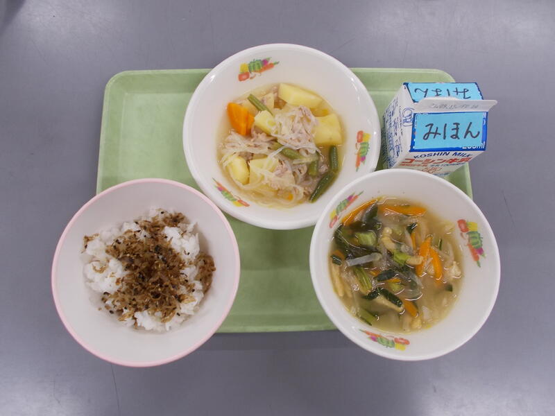今日は切り干し大根を使ったビビンバをごはんにのせて食べる丼でした。切り干し大根は煮物やみそ汁に使われることが多いですが、今日のようなビビンバにして食べると、とてもおいしいです。また、煮物もしょうゆ味では無くカレー味も食が進みます。ベーコンやにんにくといっしょに洋風スープにしてもおいしいですよ。食物繊維が多く、乾物で保存も長いのでぜひご家庭でも出番を多くしてみてくださいね。