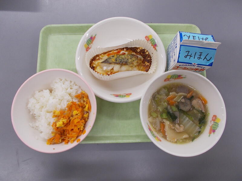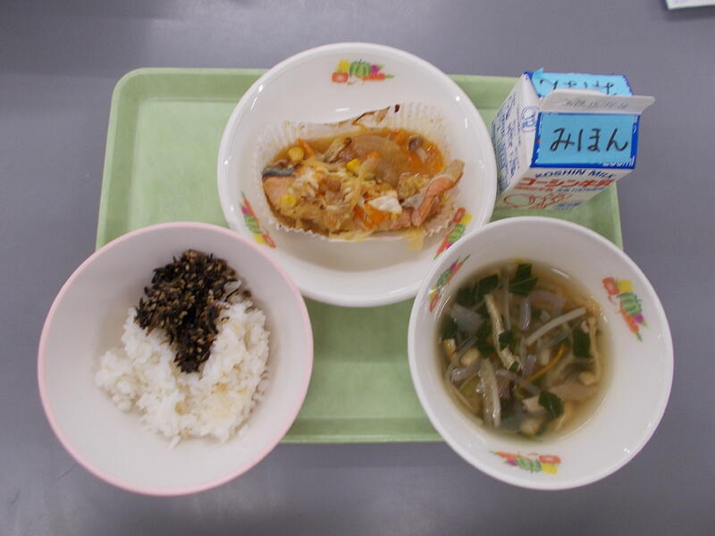 鮭のピザ焼きは子どもたちが食べやすく今の季節おいしい鮭をピザソースやチーズを使って作りました。調理員さん達が心を込めて朝から作り、おいしく出来上がりました。あるクラスの様子を見に行くと最初から「鮭のピザ焼きはいらない」とおぼんにのせない子どもたちがいてクラスの半分近くが残っていました。給食は子どもたちが健康に過ごせるように栄養価を計算して作っています。心身の成長のためにもひとくちでも食べるようにしましょう。