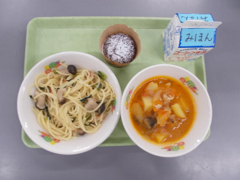 給食のスパゲティは、長さが市販されているスパゲティの半分のものを使っています。長いものは子どもたちが配膳するときや給食室で調理するときが大変なんです。今日のナポリタンは、豆乳バターを入れてうま味を増やしただけで無く、配膳のときもスパゲティが固まらないように工夫しました。職員室でもおいしいと好評でした。
