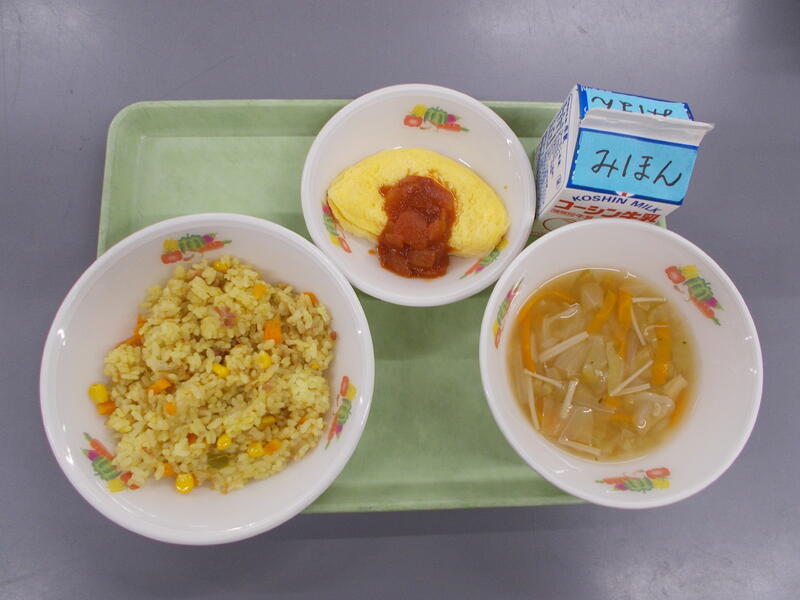コーンピラフはお米の白色、コーンの黄色、ベーコンのピンク色、にんじんのオレンジ色、枝豆の緑色と彩りが鮮やかでとてもきれいでした。今日はコーンピラフが「おいしいと」たくさんの子どもたちが伝えてくれました。とても嬉しかったです。