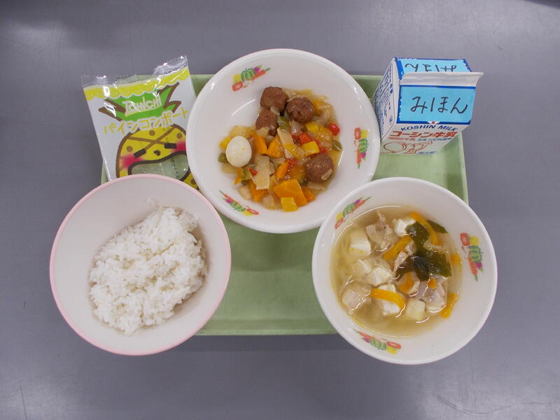 バンサンスウは、千切りした3種類の食材を合わせた和え物です。今日は彩りや栄養価アップのため5種類の食材を使いました。甘くて少し酸味もあり、つるつるした春雨やこりこりしたキクラゲなど食感も楽しむことができました。イカのカリン揚げとバンサンスウがしっかりとした味付けだったのでごはんが進みました。子どもたちもよく食べていました。