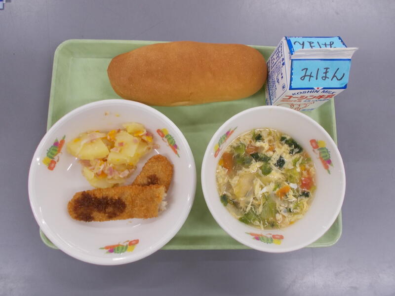 今日はパンの給食でした。コッペパンと食パンは基本パンといい、栄養価や使われている材料は同じで形が違うパンです。パンは材料に塩が使われています。学校給食の栄養摂取基準で塩分の数値が下がった時は、パンの塩分が高くてなかなか使用できなかったのですが、パン屋さん達も頑張って基準に合わせてパンに含まれる塩を少なくしてくれました。そのためパンを給食で使用することができるようになりました。コッペパンや食パンもおいしいのは、パン屋さん達の努力があるからですね。