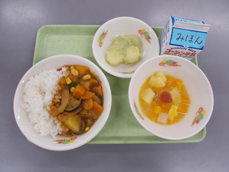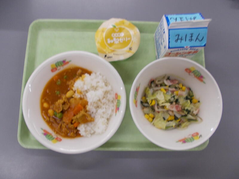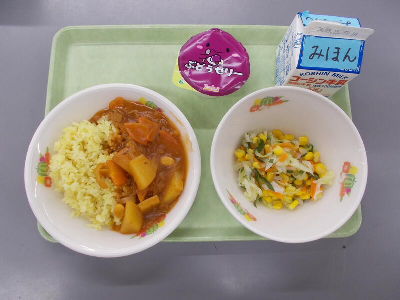 今日は朝の読み語りと図書委員会とのコラボ給食、お話給食の日でした。今日は「給食室のいちにち」という本に登場する給食と同じ給食を目指して作りました。本格カレーライスはバターと小麦粉とカレー粉をじっくりと炒めて、1時間目からおいしいそうな良い匂いがただよいました。職員室の先生方や給食室近くを通る子どもたちからは、早く食べたい、お腹がすいたあ~という声があちこちから聞こえてきました。サラダは本の中に出てくる材料を使い作りました。ブロッコリー、とうもろこし、パプリカなど彩り良い野菜のサラダはとても明るくきれいで華やかでした。もものゼリーは各クラスにおまけが入り楽しみが増えました。今日は残菜がとても少なくて、全校の子どもたちが揃ったらもっともっとたくさんのカレーライスを作らないと思ってしまいました