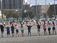 前半は、開会式から始まりました。「学校紹介」の場面では、代表のお友達がとっても上手に発表することができました。続いてグループをつくって自己紹介をした後、グループ対抗の「ひらがな並べゲーム」「逃走中」で盛り上がりました。