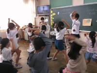 また、本校第二校舎1階にある「ミニアリーナ」も冷房が入っており、1クラス程度の人数なら体育の授業が可能なスペースとなっています。今日は2年5組がからだ作り運動を行っていました。1・2年生の体育は、今年度は、校庭や体育館では2クラス合同で、専科の先生も加わって教員3人で授業を行っていますが、雨や暑さのために校庭が使用できないときは、ミニアリーナで時間を分けて1クラスずつですが、体育の授業を中止することなく行うことができるので、とてもありがたいです。
