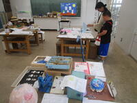 校内夏休み作品展1日目。5時間目までは各クラスが展示を見学していました。放課後は、保護者の方も参観においでくださいました。
