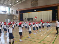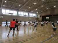 3年4組は、体育館で「プレルボール」をグループごとに協力して練習していました。