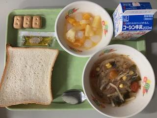 今日の給食は、9月1日の「防災の日」にちなんだ献立でした。メニューは、「防災スープ」「フルーツあえ」「乾パン」「食パン」「はちみつ」でした。スープは切り干し大根や春雨、カットわかめやコーンなど乾物や缶詰の材料を中心にしたもので、フルーツあえもシロップ漬けフルーツがメインでした。ご家庭でも、常備してあるものでおいしくて栄養のあるものを作るヒントになりますね。最近は、スーパーなどで保存の利く食品が多く置かれるようになりましたが、 「乾パン」は初めて食べるという児童もいたかもしれません。パンにつけるはちみつはエネルギー源としてもすぐれています。給食で出されたような小分けのパックは、いざという時に便利だな、と思いました。乾パンにもちょこっとつけてみたらおいしかったです!