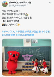 昨日来校されたチーバくんキャラバン隊のブログに本校のことがアップされていました。キャラバン隊の方々が、控え室(会議室)の黒板に1年生の職員が描いた、チーバくんのイラストやウェルカムメッセージをご覧になって大変感激され、その前で写真を撮られていたものです。来年もまたよろしくお願いします!ありがとうございました!