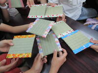 今日は、図書室ボランティアさんがいらっしゃいました。今は、本の貸し出しをバーコード入力で行っていますので、従来の貸し出しカードが余っていますが、その貸し出しカードを使ってすてきな本立てを作ってくださいました。貸し出しカードを組み立てると強度があり、しっかりと本を支えることができます。ある物を生かしたSDGsにつながるすばらしい取り組みに頭がさがりました!