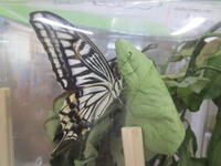 そして、ゴールデンウィーク明けの5月8日に司書の先生が持ってきてくれたアゲハの幼虫が、今日、蝶になっていました!写真左の小さな矢印の部分に見えるのがさなぎの抜け殻です。今日、図書室に訪れたたくさんの子ども達が見事に羽をひろげたアゲハ蝶に気づいて観察していました!