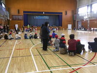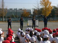 前半は、開会式から始まりました。「学校紹介」の場面では、代表のお友達がとっても上手に発表することができました。続いてグループをつくって自己紹介をした後、グループ対抗の「ひらがな並べゲーム」「逃走中」で盛り上がりました。