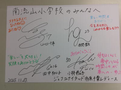 サッカー体験終了後、ジェフユナイテッド市原千葉レディースの4人の選手お一人お一人から、6年生に「好きなことを見つけてうちこんでください」などのメッセージを一言ずついただきました。6年生の子供たちに、素晴らしい時間と、すてきなメッセージをいただき、まことにありがとうございました。共にサッカーをしたりお話を聞いたりするうちに、子供たちは(私達教員も)選手やコーチのお人柄にすっかり魅了されました!皆様のご活躍を応援しています!また、このような事業を企画してくださいました千葉県庁生涯スポーツ振興課の皆様、ありがとうございました。