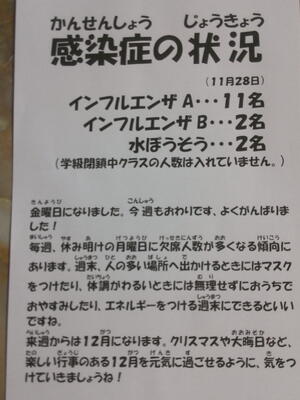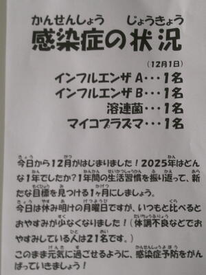 保健室からのお知らせのように、休み明けに体調不良の児童が増える傾向にあります。冬休みまでの登校日はあと17日です。「早寝・早起き・朝ご飯」で、1年のしめくくりの月をみんな元気にすごせますように!